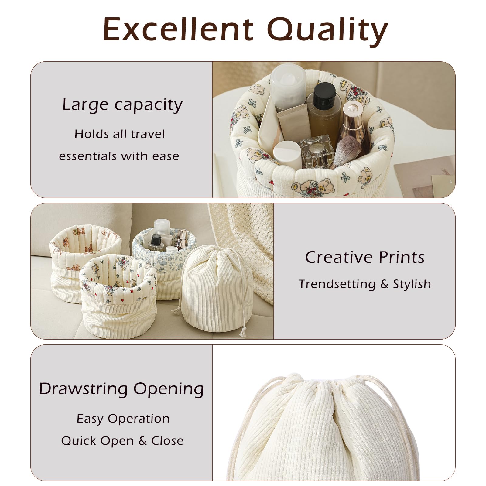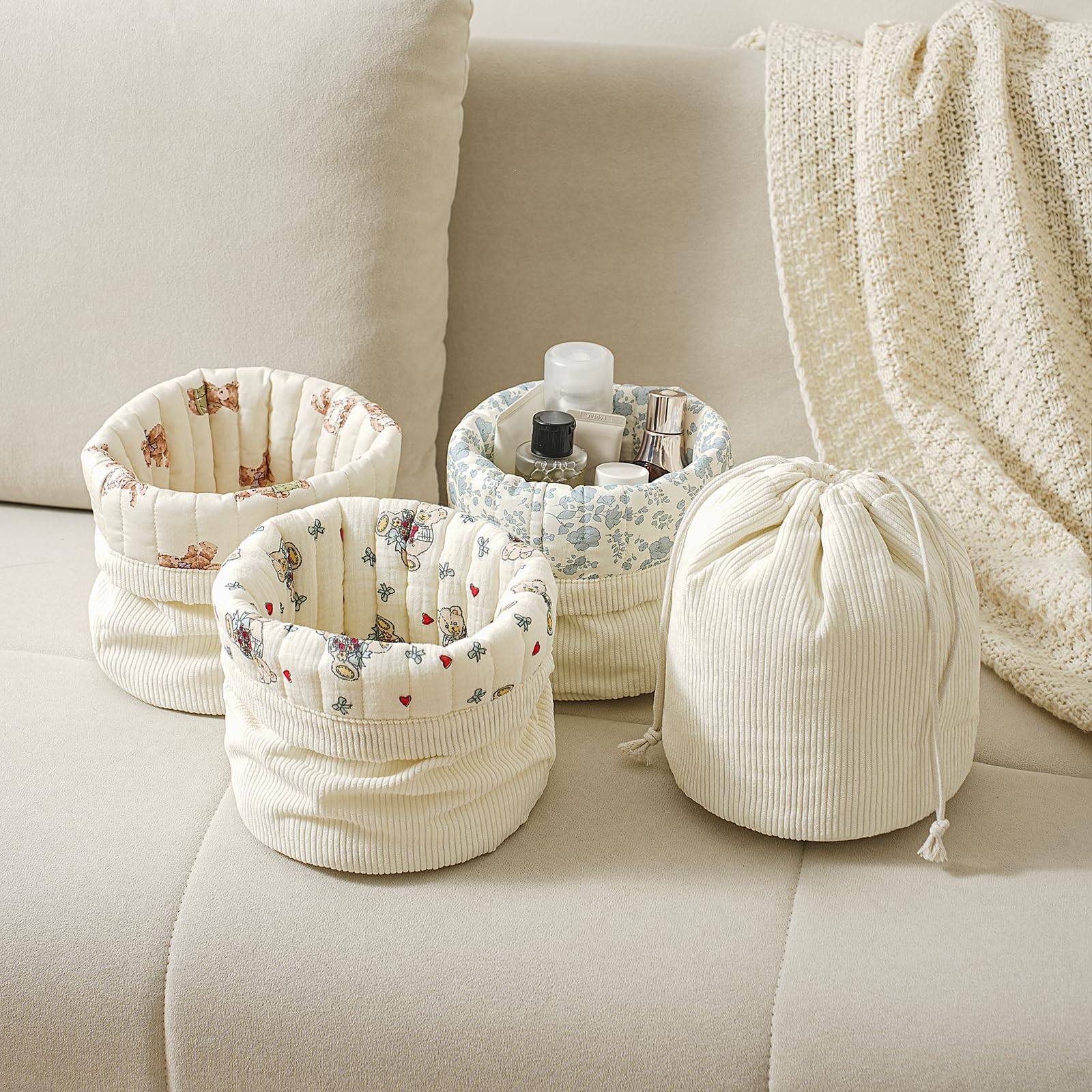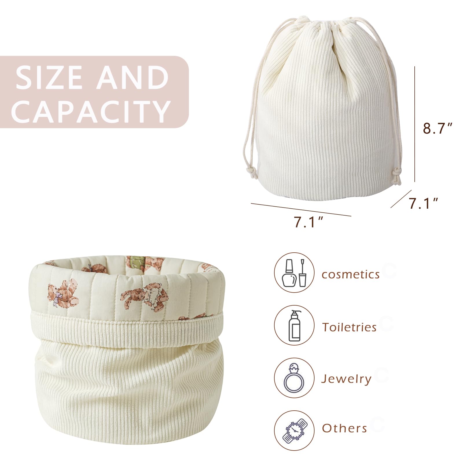 RSRSLEII Aesthetic Corduroy Drawstring Makeup Bag with Quilted Lining, Coquette Quilted Cotton Cosmetic Bag, Portable Travel Organized Toiletry Bag for Women Girls(05White Rabbit Bear)