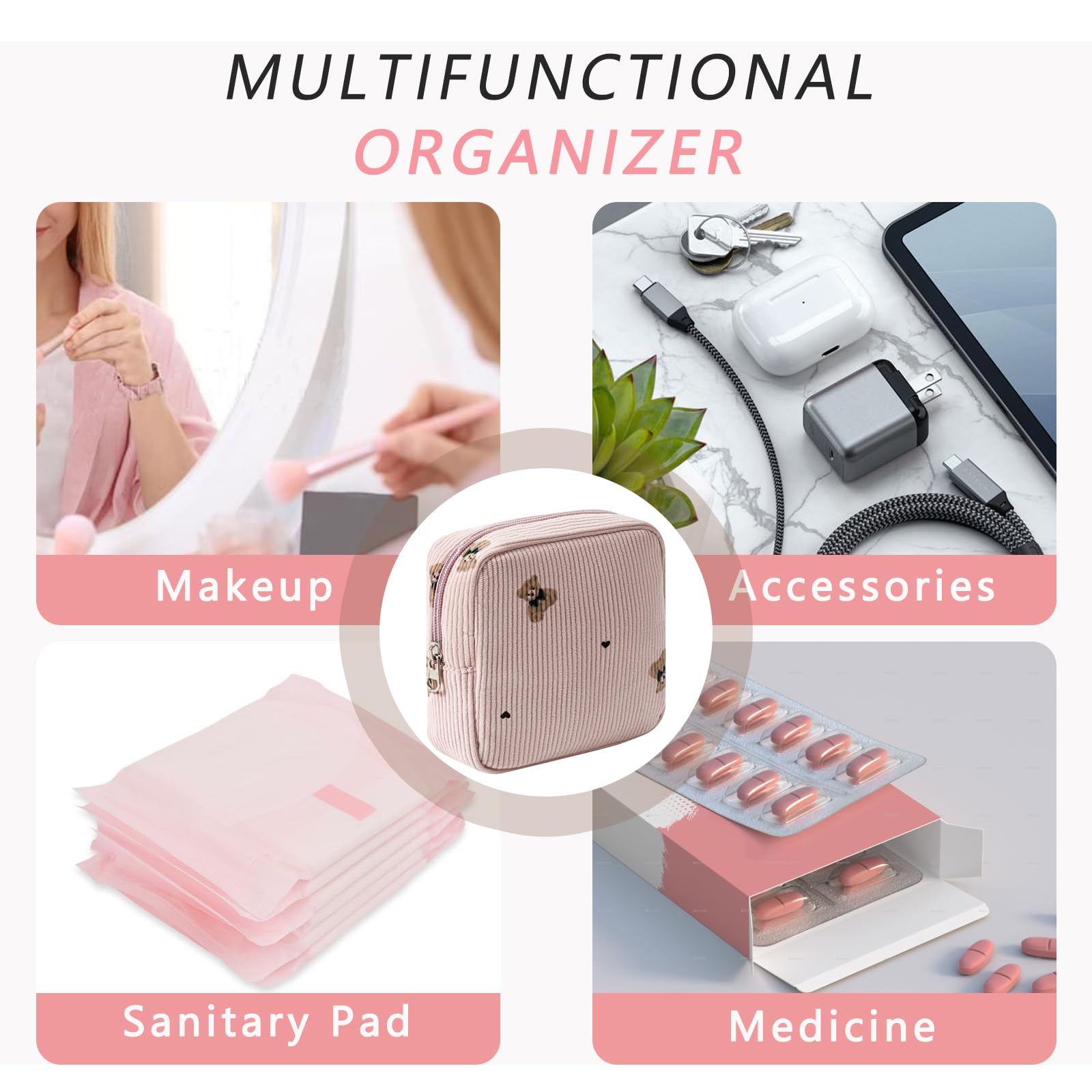 - [Product Size]: The dimensions of the Corduroy Makeup Bags are: 5.1inches x5.1 inches x 2 inches. This cosmetic bag is what you need for your home organization and trip, easily holds your makeup and small cosmetic accessories, lipstick, lip gloss, brushes, skincare products, toiletries, 3c items.