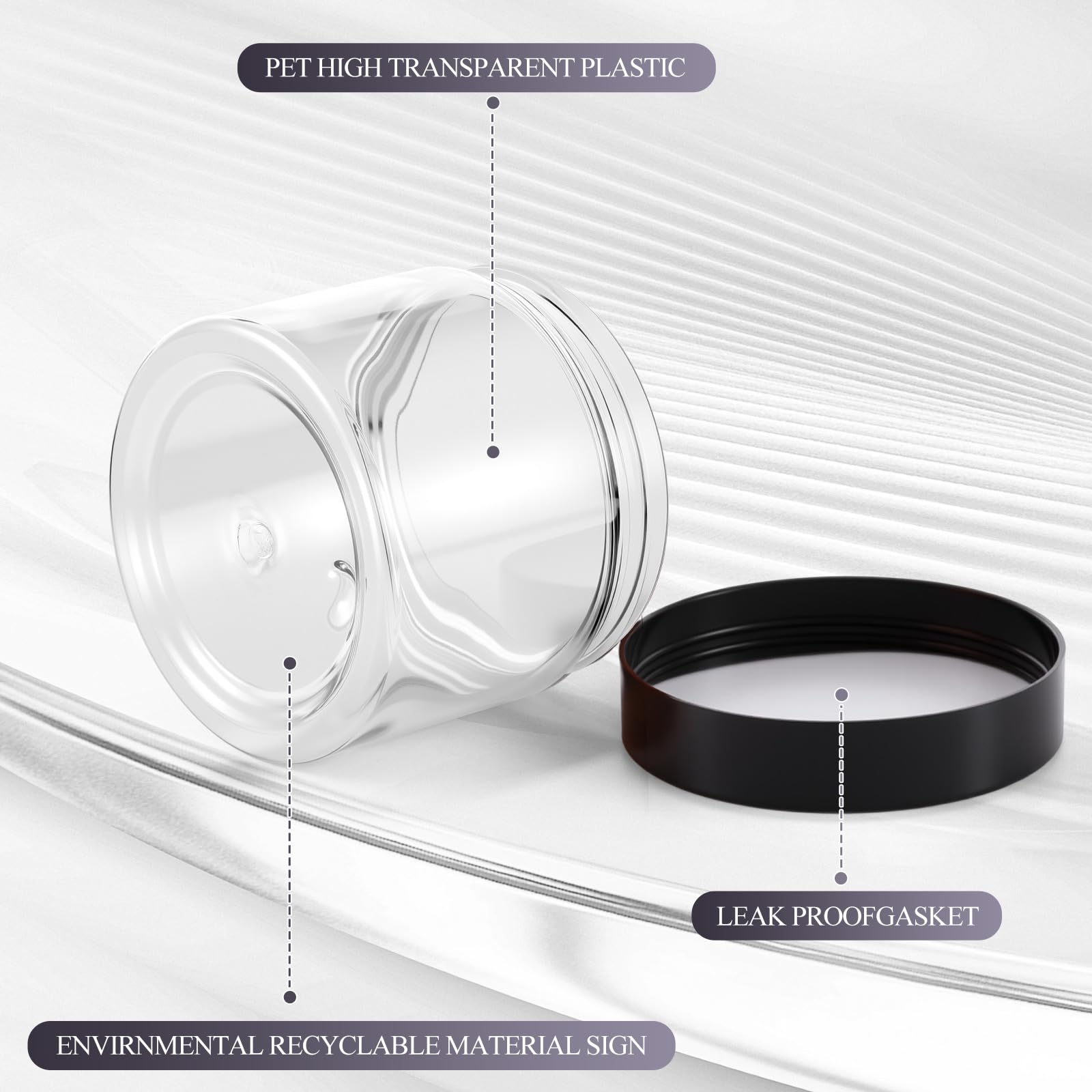 - Quality material: the 2 oz plastic jars with lids are made of quality clear plastic, without odd smell, does not contaminate your skincare products, stable, high temperature resistance, a white plastic cover with lid, sealed storage and leak proof