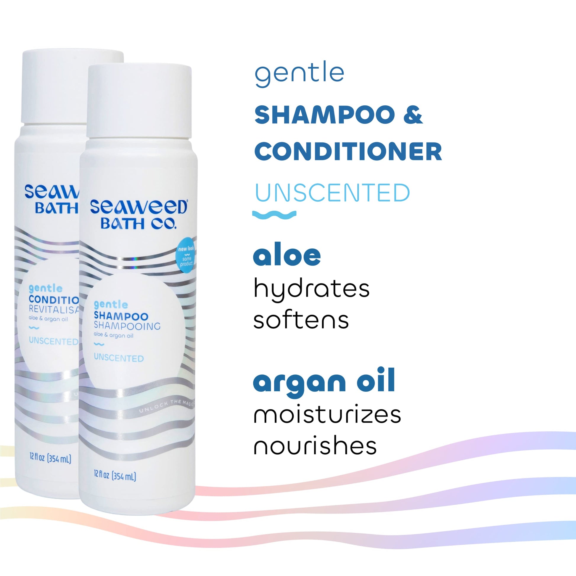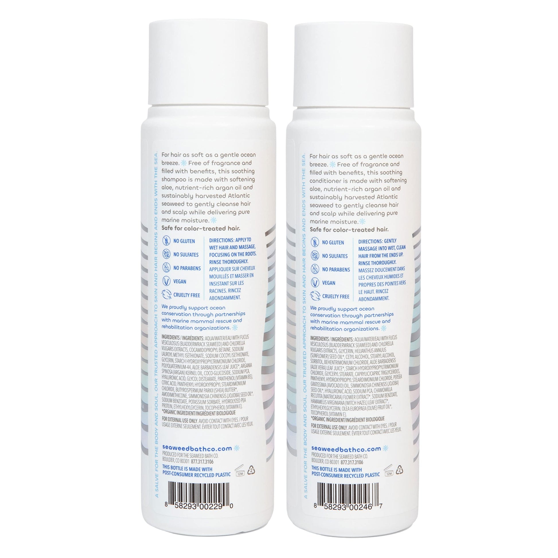 Details: Unlock the magic of the sea with Seaweed Bath Co. Gentle Shampoo and Conditioner. This unscented duo cleanses with sustainably harvested Atlantic seaweed while aloe and nutrient-rich argan oil deeply hydrate hair and scalp to achieve healthy moisture and shine. Inspired by the idea that nature already knows, we started with a centuries old remedy - seaweed baths - while on a personal journey to find a better troubled skin solution. Since then, Seaweed Bath Co. has continued to use sustainable practices to unlock the nourishing and restorative gifts of the ocean, harnessing its benefits in every product we make. We proudly support ocean conservation through partnerships with marine mammal rescue and rehabilitation organizations.