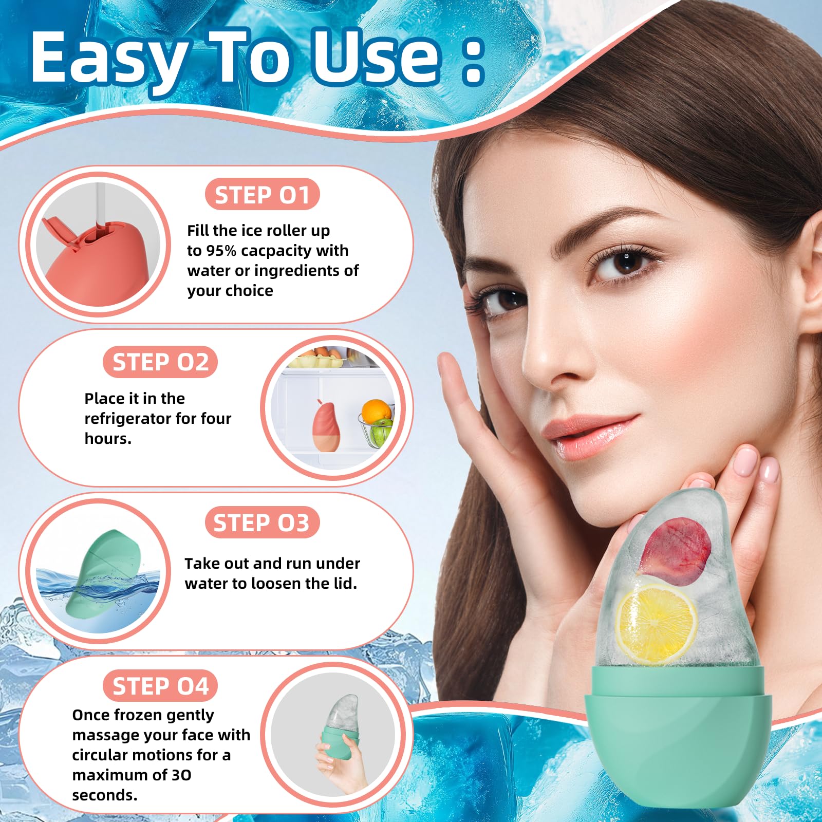 - 💐🌿【Easy to Use】 After filling and freezing for three to four hours, you can take it out of the refrigerator to thaw or soak it in hot water for a while, and then you can easily open it for use. Make sure not to fill the mold up completely because water expands when it's cold. To use, apply ice to skin in circular motions every 30 seconds. NOTE: Water droplets may be generated during use, please prepare a dry towel in advance.