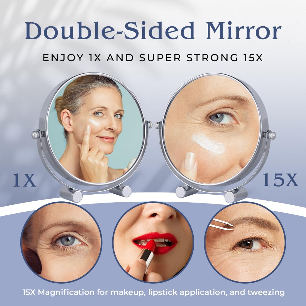 Small 15X Magnifying Tabletop Mirror for Makeup - Double Sided 15x and 1x Portable Make Up Mirror for Desk, Dressing Table and Retail Store - 6" Wide & 6.7" Tall (Chrome)