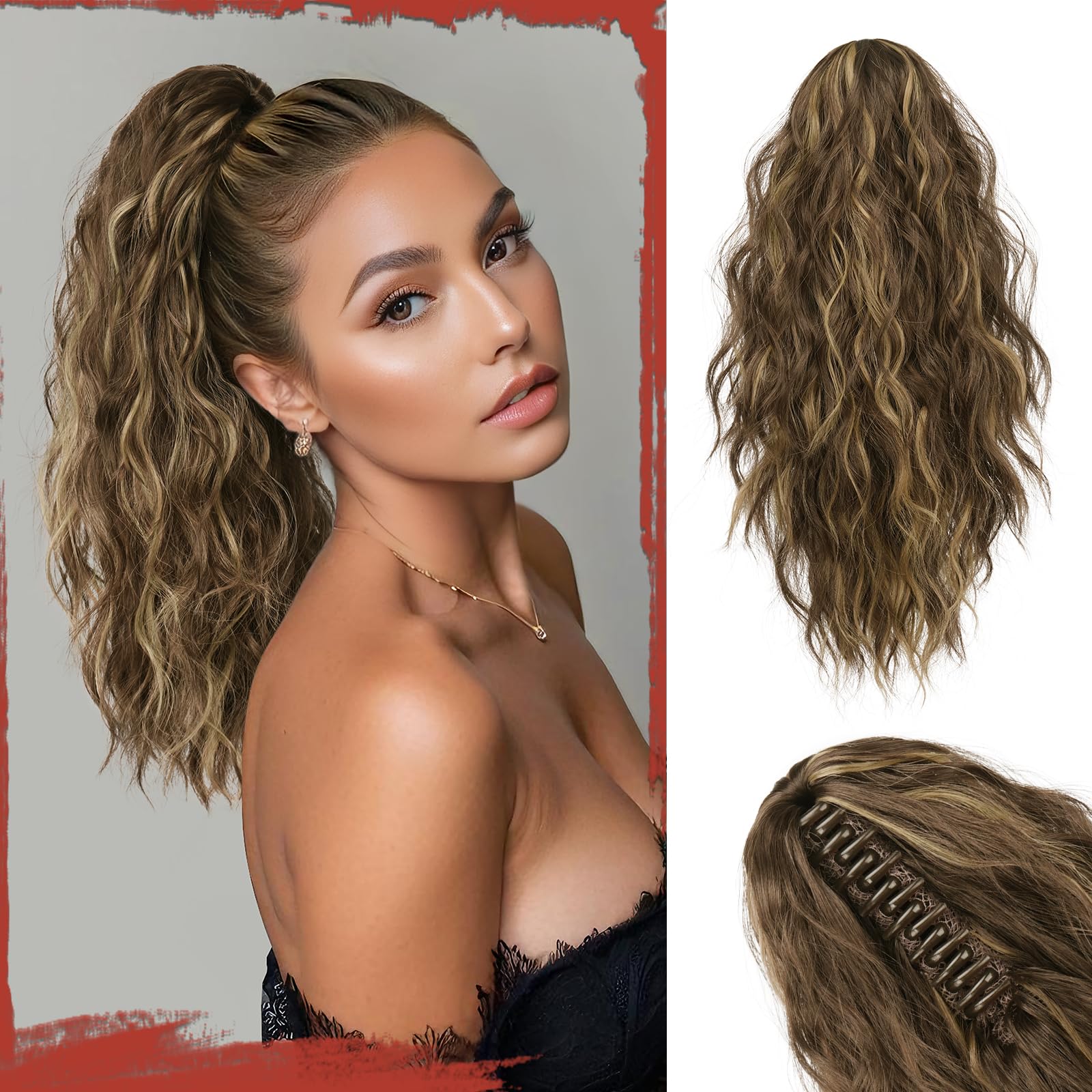 SOFEIYAN Ponytail Extension, 16 inch Claw Clip Ponytail Extension Wavy Curly Ponytails Synthetic Pony Tails Hair Extensions Natural Fake Hairpiece for Women - Honey Blonde Mixed Light Brown