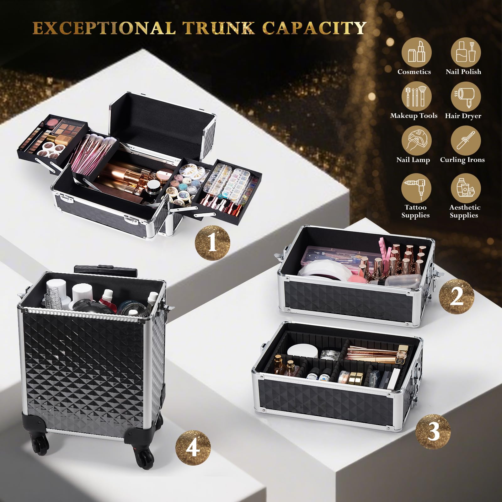 Stagiant Rolling Makeup Case Cosmetology Case on Wheels 4 in 1 Large Cosmetic Organizer Train Case Makeup Travel Case with Key Swivel Wheels Nail Artist Salon Storage Traveling Cart Trunk Black