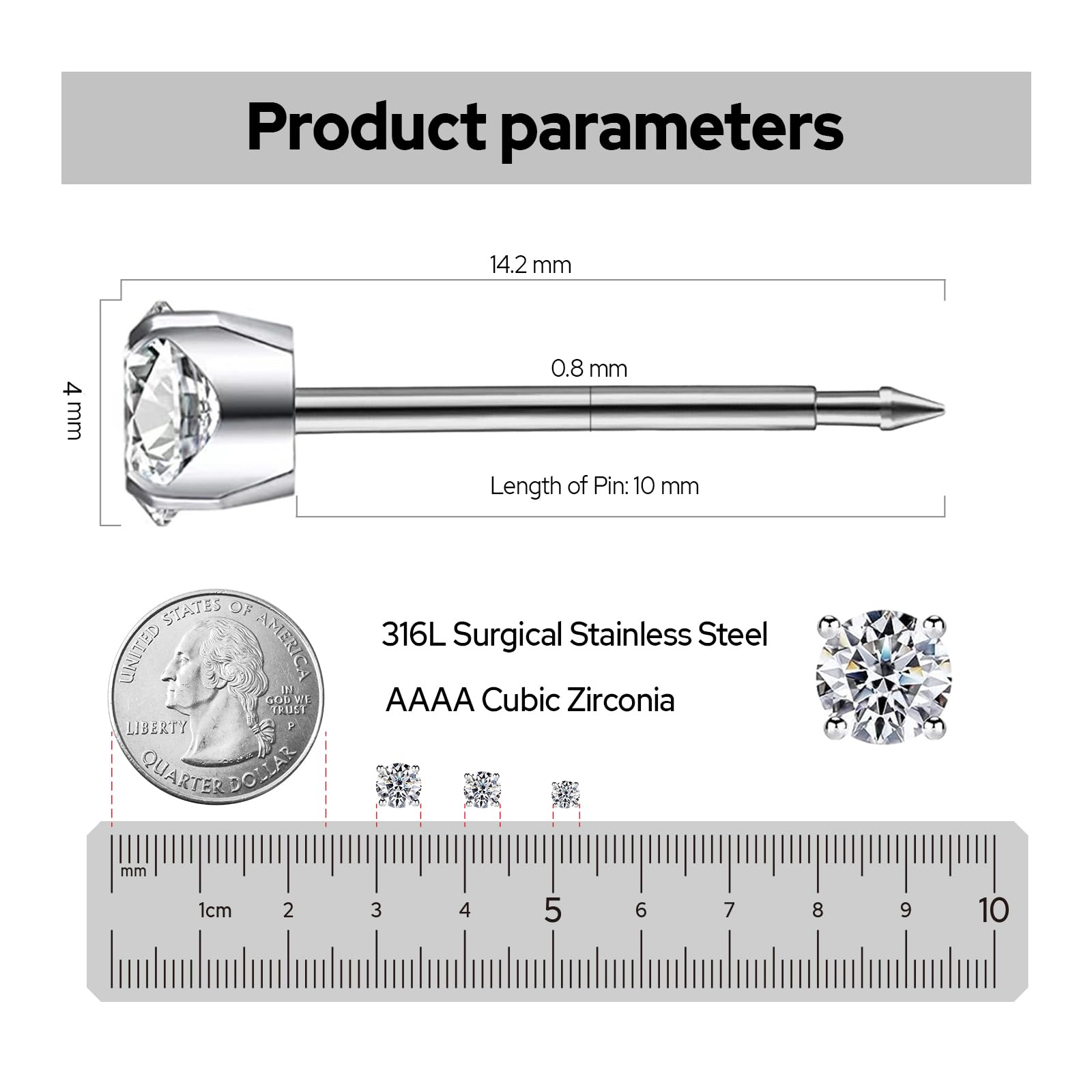- [Size] Cubic Zirconia:4mm; Diameter of Pin: 20 Gauge (0.8mm); Length of Post: 0.039"(10mm); sharp enough to make an actual clean incision thru the flesh.SugarTang offer styles of earrings stud, hoop earrings to change your starter earrings after 4-6 weeks