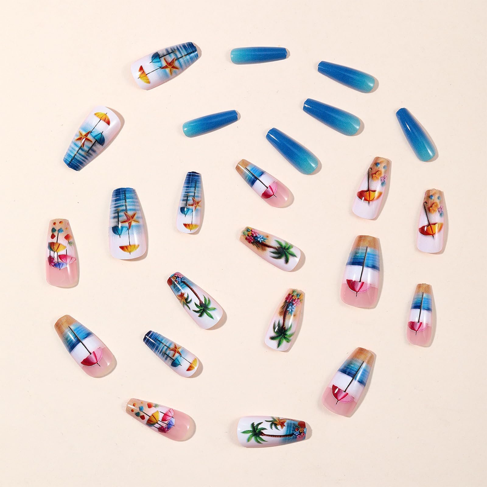 Details: Summer Beach Press on Nails, 24Pcs Medium Coffin Summer Spring Acrylic Glue on Nails for Coquette Women Girls, Glossy Blue Gradient Fake Nails with Exquisite Designs