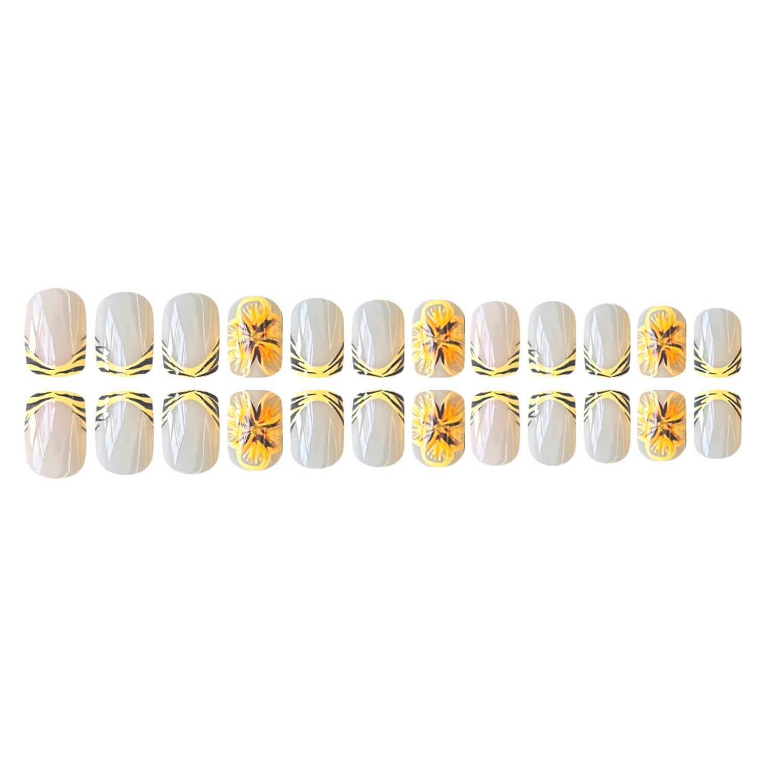 Summer Press on Nails Short Square Fake Nails Yellow with Flower designs Stick on Nails Full Cover Leopard Print French Tip Press ones False Nails for Women Glue on Nails Beach Nails 24pcs