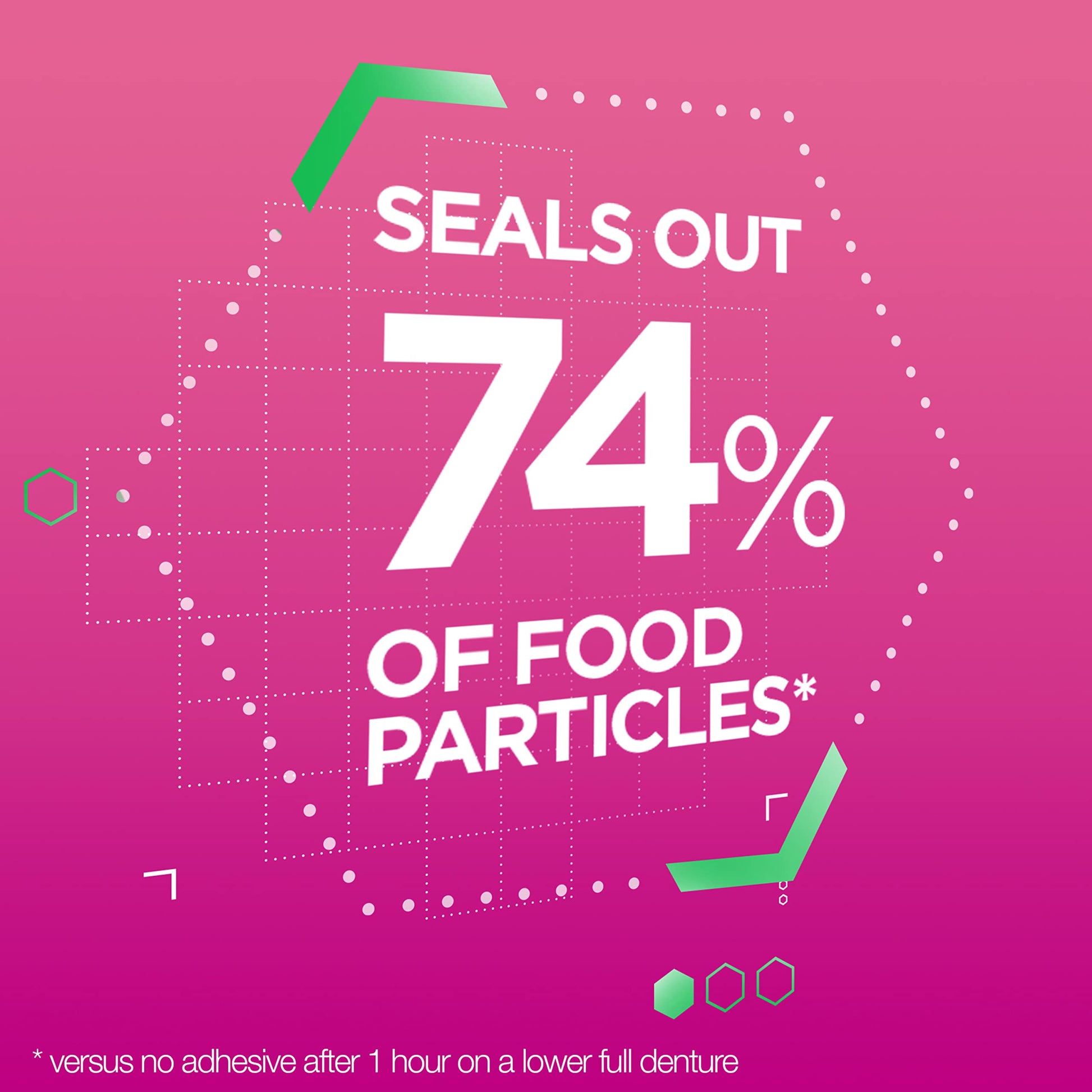- Super Poligrip denture products seal out food particles to prevent gum irritation