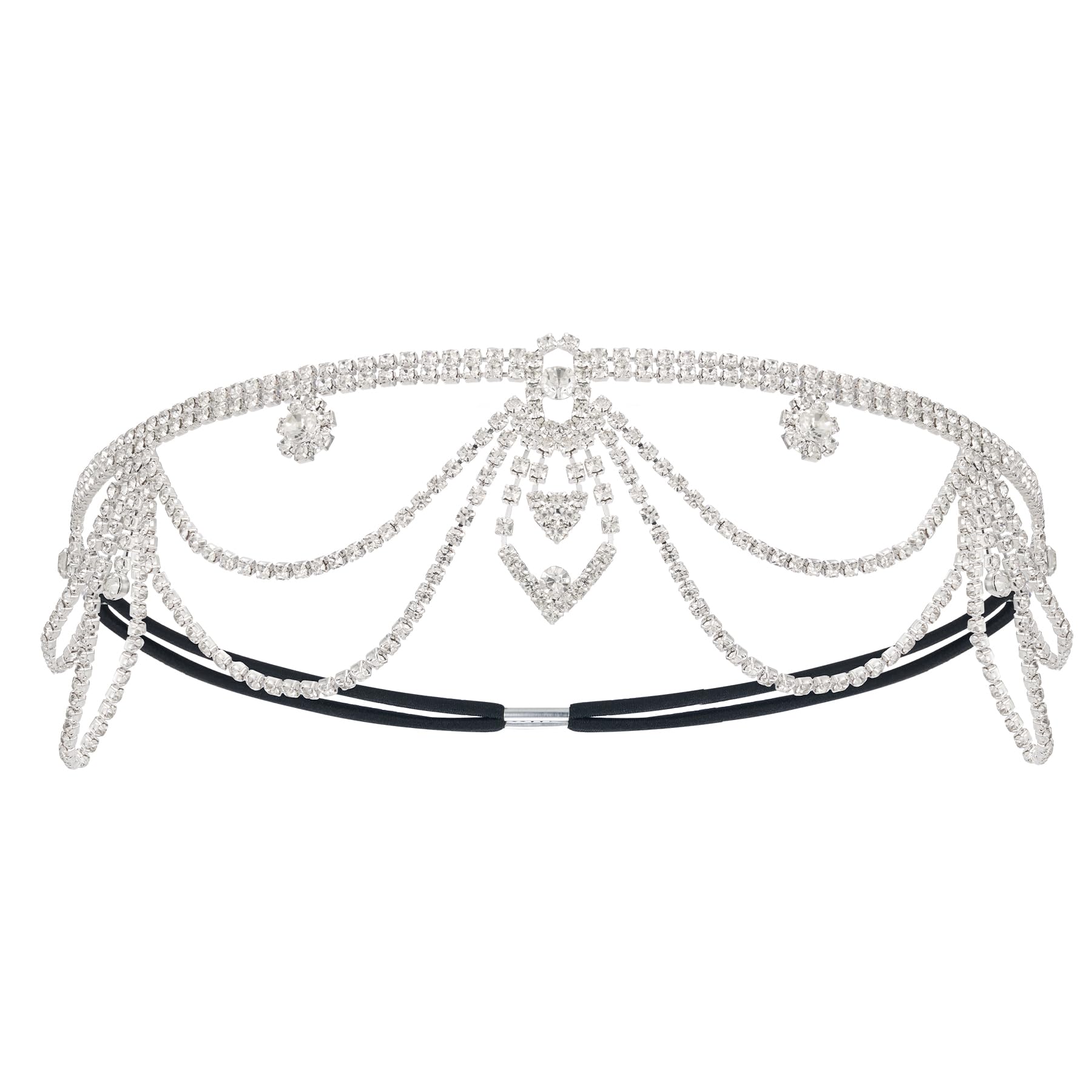 SWEETV Roaring 20s Crystal Rhinestone Head Chain Jewelry Silver Headpiece Hair Accessories for Women