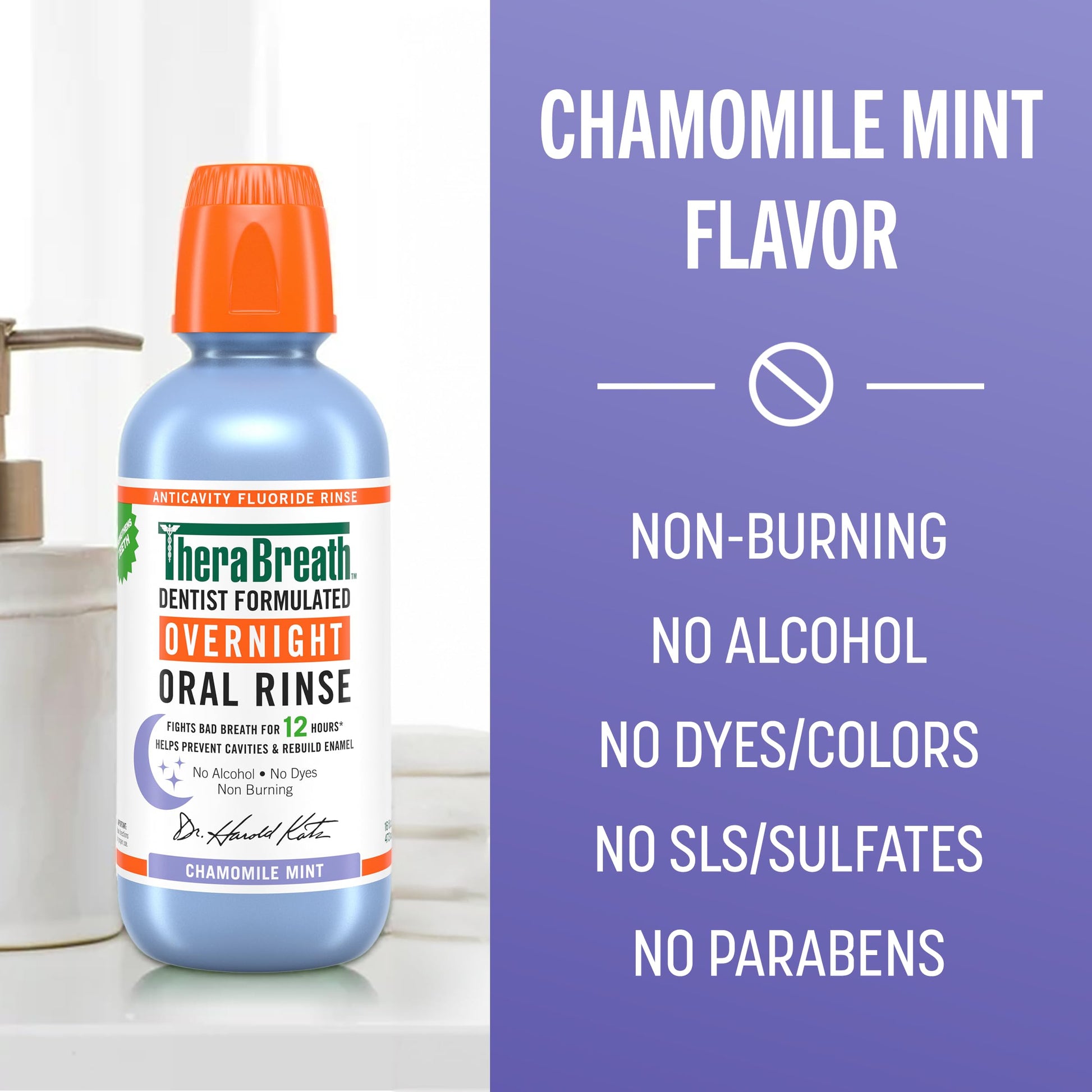 Details: Make bedtime swishy time! TheraBreath Overnight Mouthwash fights bad breath for 12 hours*. Use this mouthwash to help rebuild weakened tooth enamel, strengthen teeth and prevent cavities. This alcohol-free mouth rinse has a soothing chamomile mint flavor that helps freshen you up while you’re winding down.TheraBreath Overnight Mouthwash is proudly not tested on animals and is certified gluten-free, vegan, Kosher, and Halal. It’s also free from alcohol, dyes or colors, sulfates and parabens. This new kind of night cap is for the grown ups only! Adults 18 years or older can swish 2 tablespoons between teeth for 60 seconds once a day, after brushing. Do not eat or drink for 30 minutes after rinsing. Create your bedtime rinse routine and give your mouth some anticavity TLC at EOD. TheraBreath Overnight Mouthwash is 100% guaranteed so you can self-care while you snooze, confidently. Join the millions who have made TheraBreath the #1 fastest growing mouthwash brand in the USA (1).