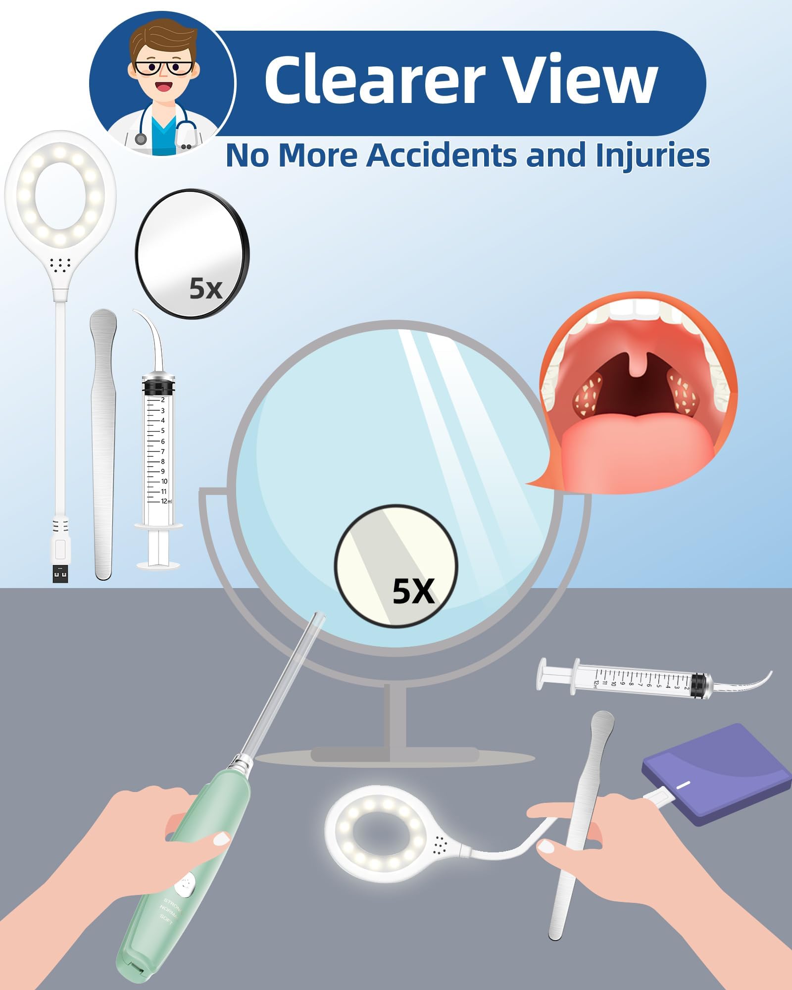 - See and Clean with Precision: Equipped with a 5X magnifying mirror and a bright oral lamp which is 150% brighter than the alternatives, our tonsil stone removal kit takes the guesswork out of tonsil stone removal by illuminating and targeting tonsil stones with precision!