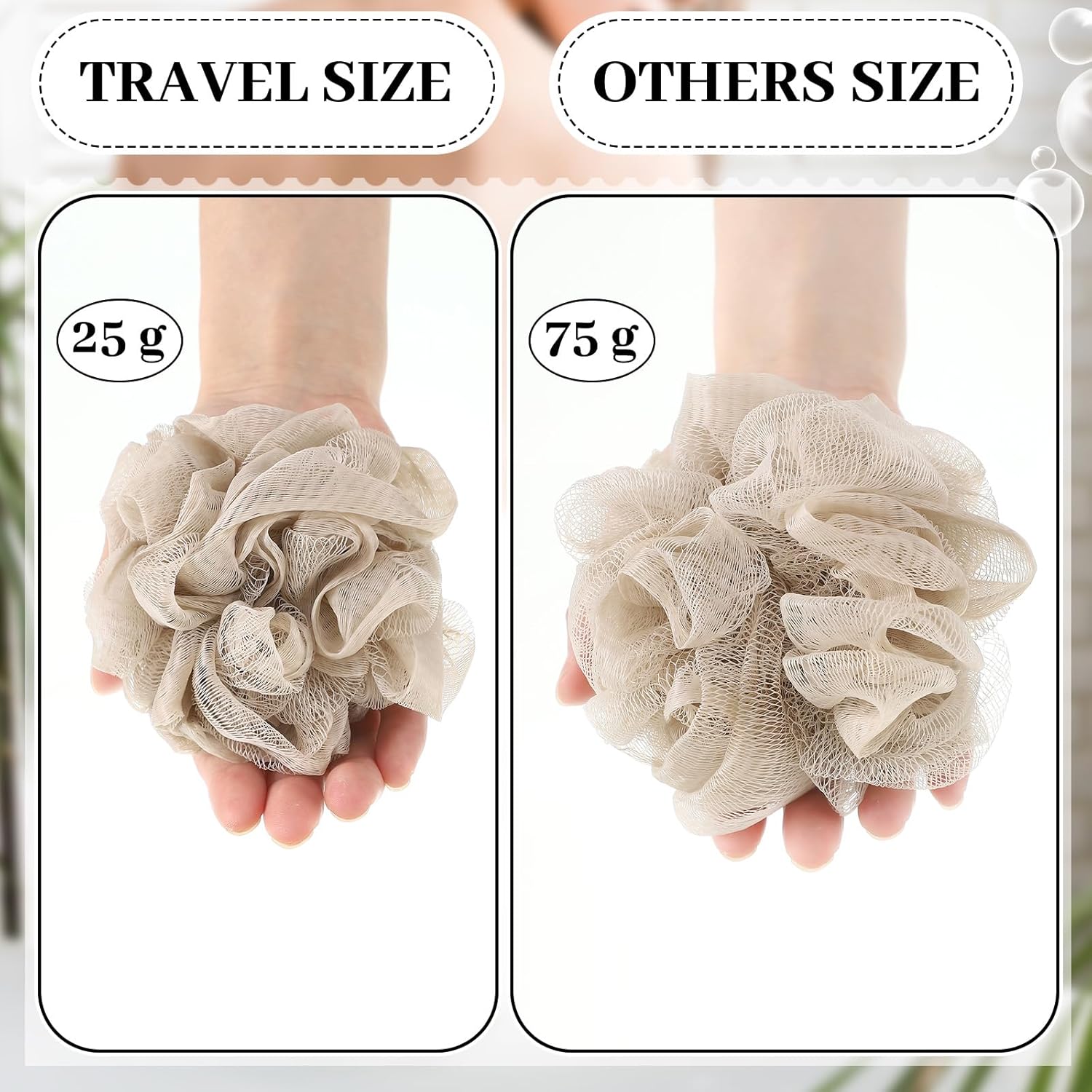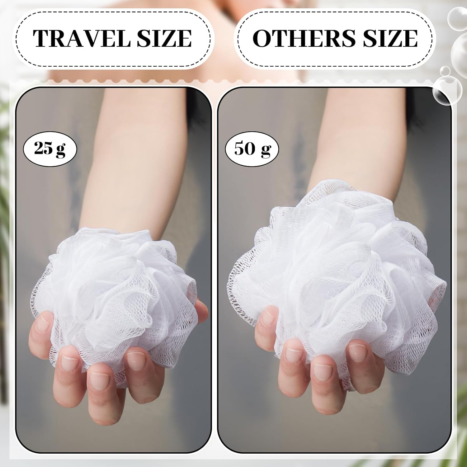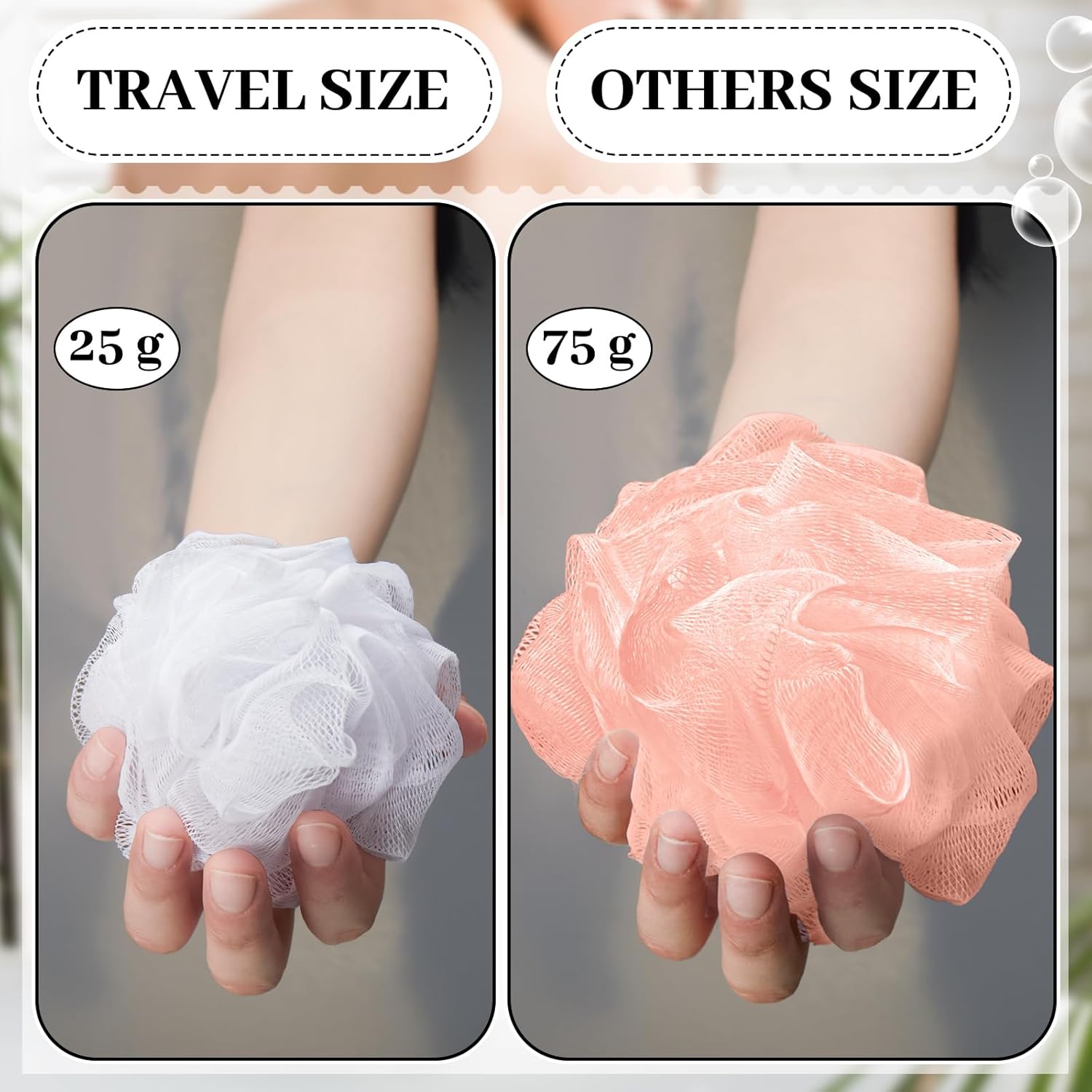 - Right Size for Your Travels: the shower loofahs weigh only 25 g each, size about 4 x 4 inches/ 10 x 10 cm, with an individually wrapped size of 5.91 x 5.91 inches/ 15 x 15 cm that conveniently fit in your toiletries bag; This size denotes that you can have your bath accessory by your side even in your travels; Note: the package is vacuum packed, volume of the product may be compressed; Recommended to soak in warm water before first use