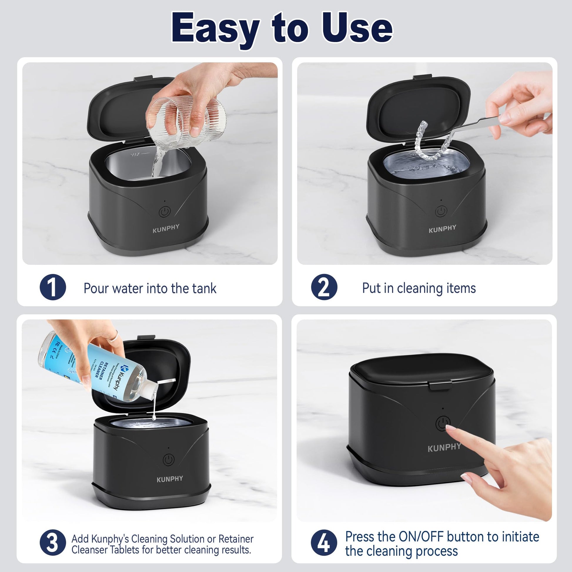 - ⚡Easy To Operate: Retainer cleaner machine equipped with easy-to-use one-touch control. Simply place items into the cleaning tank, press the start button, and the five-minute scheduled cleaning will begin. ( For best results, use KUNPHY Ultrasonic Retainer Cleaning Solution, warm water or retainer cleaner tablets to tackle stubborn stains.)