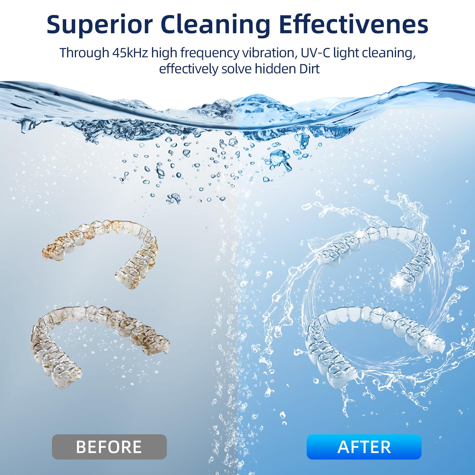 - 【Advanced Ultrasonic Technology】The Ultrasonic Retainer Cleaner employs high-frequency 45kHz sound waves, effortlessly removing dirt from retainers, mouth guards, and dental appliances, reaching all the hard-to-clean corners and crevices without causing any harm to them. Opt for EcoBasic for an efficient cleaning experience, offering 360°comprehensive stain removal
