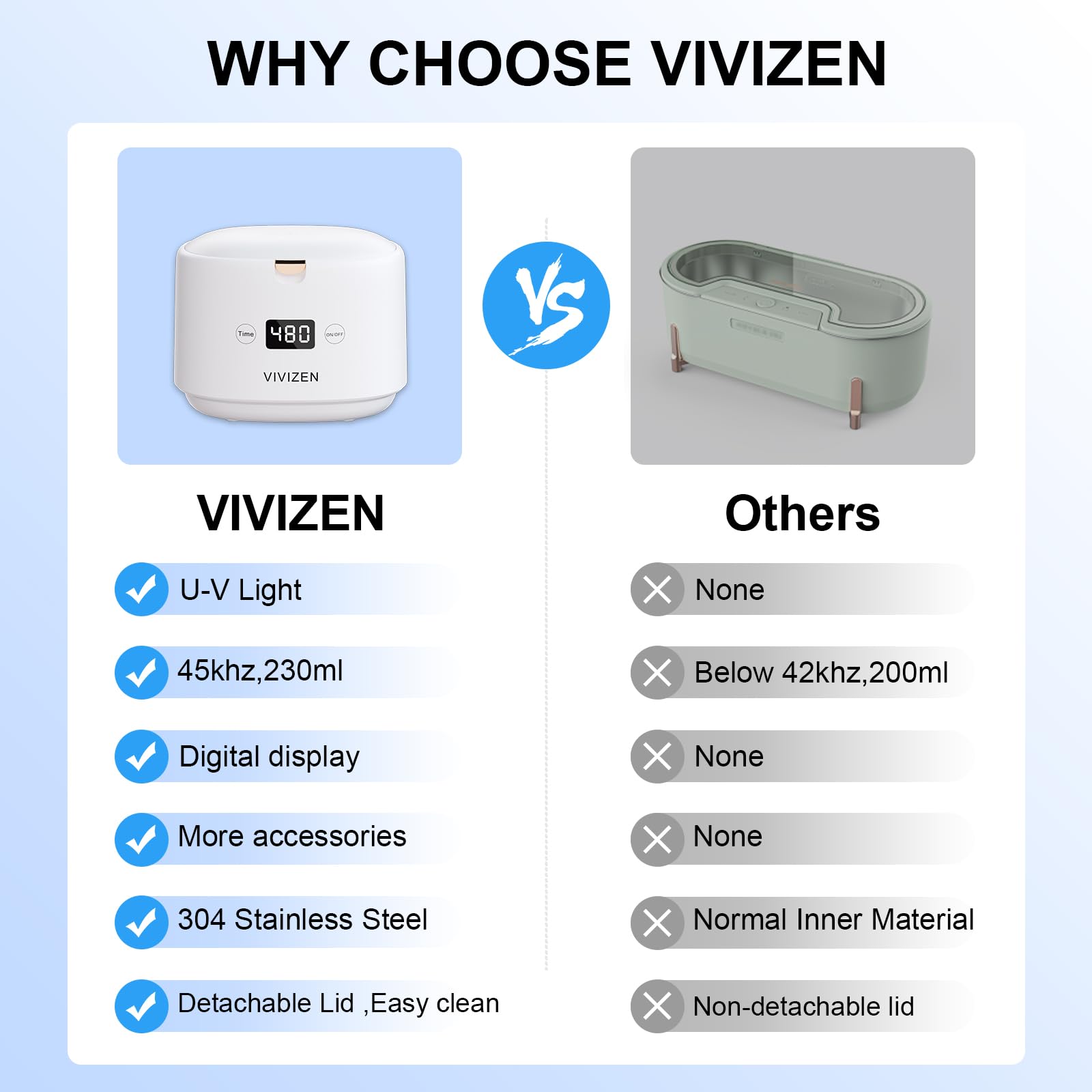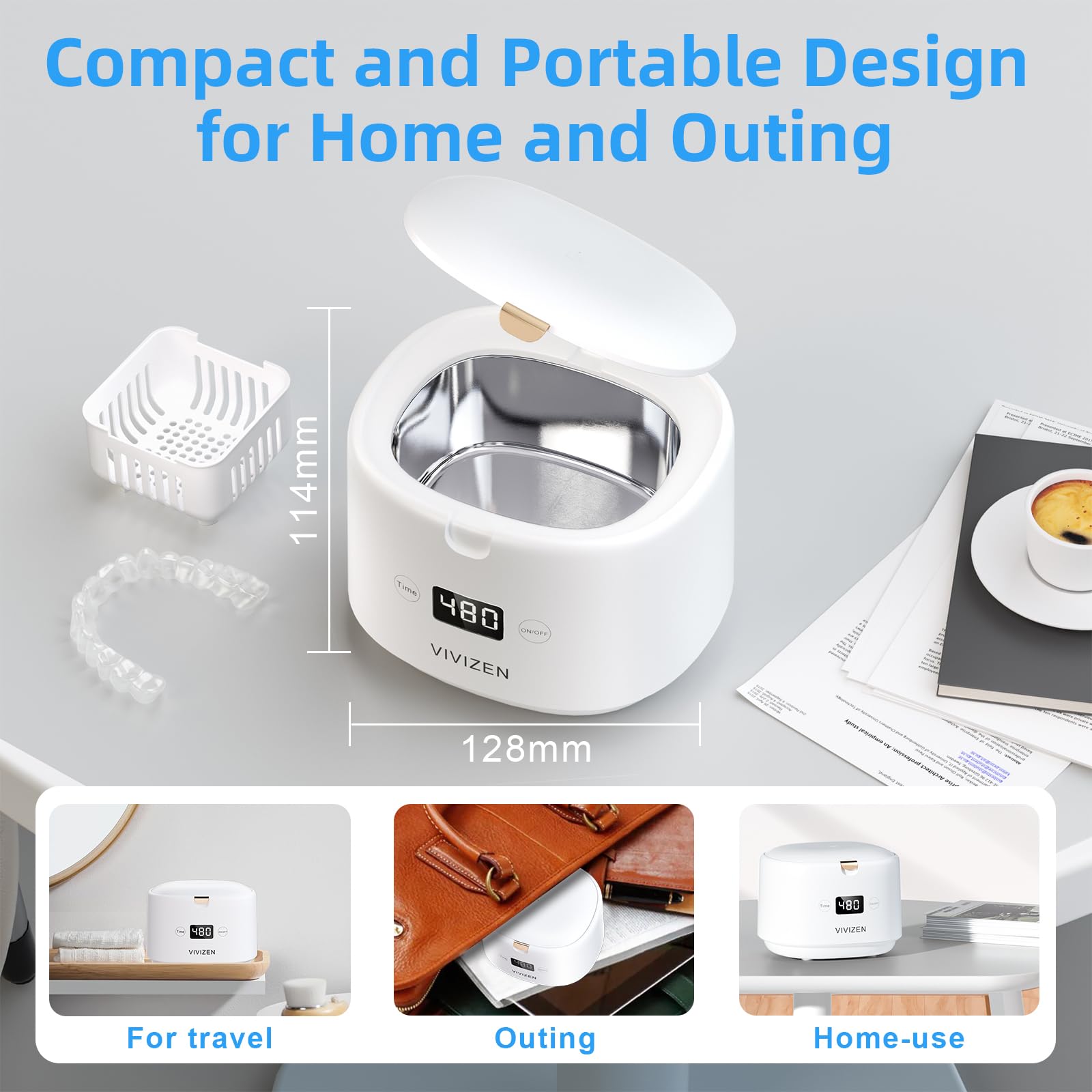 - [Professional and Efficient Cleaning] VIVIZEN ultrasonic retainer cleaner utilizes 45,000Hz sound wave technology to effortlessly eliminate surface particles and dirt, ensuring a thorough 360° all-round deep clean. Ideal for aligners, braces, mouth guards, and jewelry, this powerful 30W retainer cleaner reaches inaccessible areas for a pristine finish.