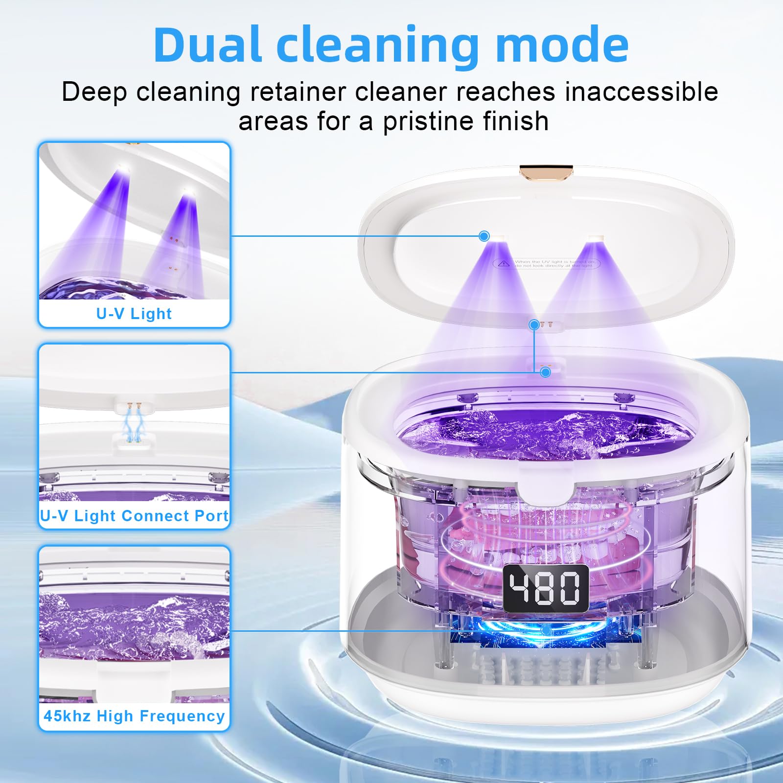 - [Customizable Cleaning 5 Modes] With various cleaning modes, our ultrasonic retainer cleaner suits a range of items including aligners, braces, mouth guards. Users can easily select the cleaning time length (90s, 180s, 280s, 380s, 480s) and opt for the deep cleaning mode, resulting in restored items that look as good as new.