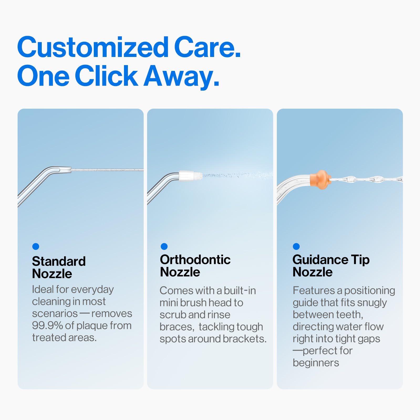 - ✅ Tip: Open the tank lid for faster refills—no need to use the side port. Charging cable will be available online soon; contact us if you need one now. Nozzles can be stored inside the flosser or in the dedicated nozzle case (available on our website). Thoughtful design, just for you.