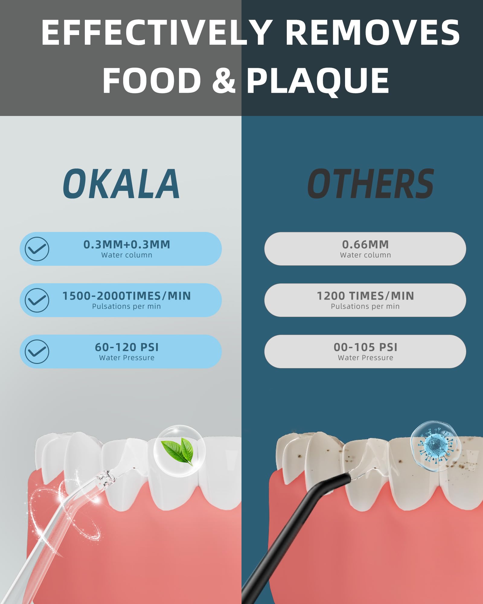 - 【Powerful Water Teeth Cleaner for a Refreshing Clean】OKALA water dental flosser pick features a high-performance motor generating 1500-2000 times/min, delivering a thorough water stream to help clean hard-to-reach areas and gently stimulate your gums. This portable water flosser is designed to support your daily oral care routine, leaving your mouth feeling fresh and clean.