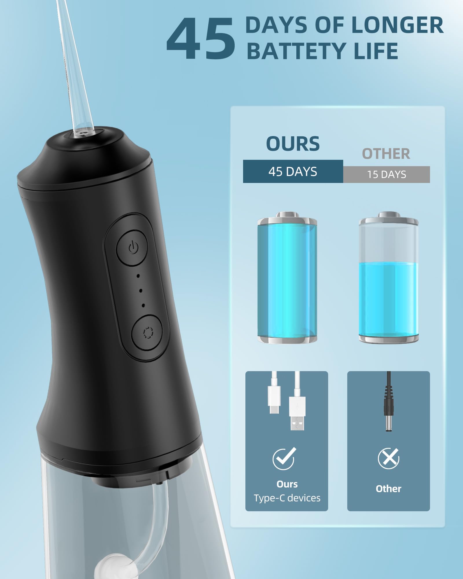 - 【45 Days Super Long Battery Life, Portable Use Anywhere】This electric water flosser Teeth Picks rechargeable with a powerful eco-friendly battery. Just charge for 4 hours and enjoy 45 days of use, making it a truly portable solution for your convenience. The water dental pick is compact and lightweight, suitable home, office, business trips or traveling use on the go. This oral irrigator comes with a charging cable (adapter not included) making it an ideal travel kit.