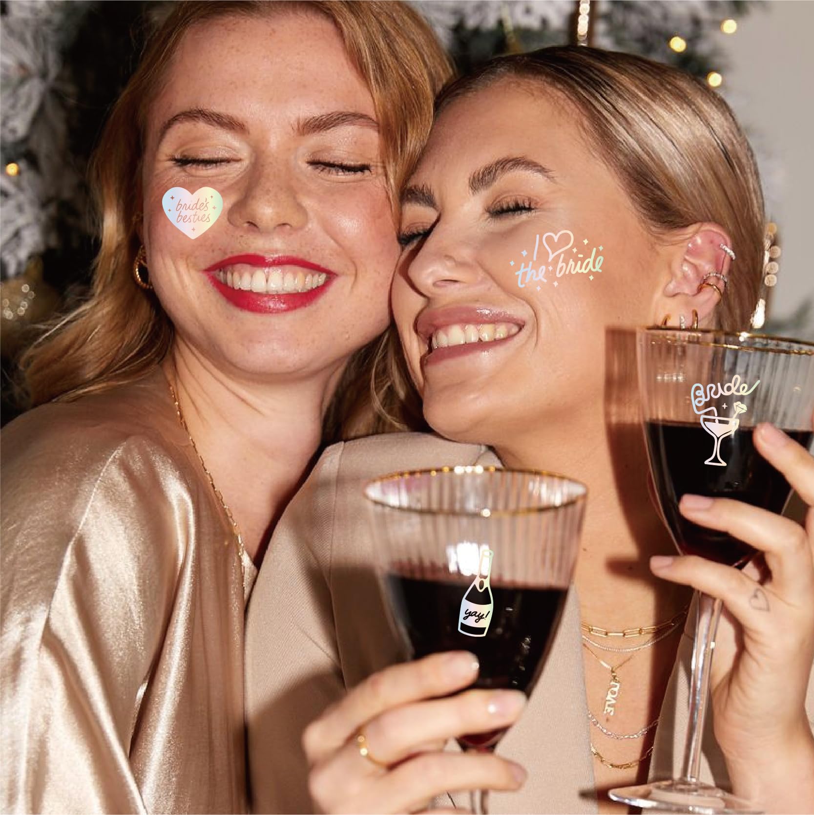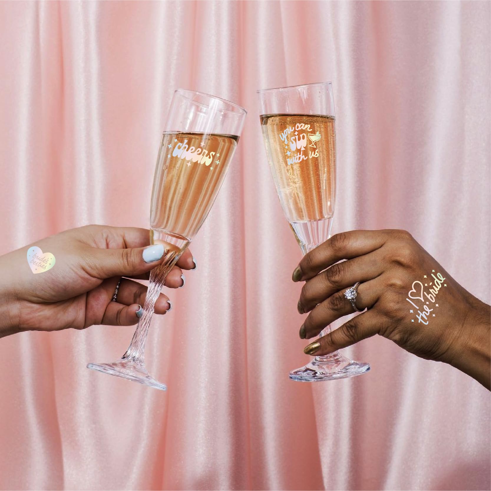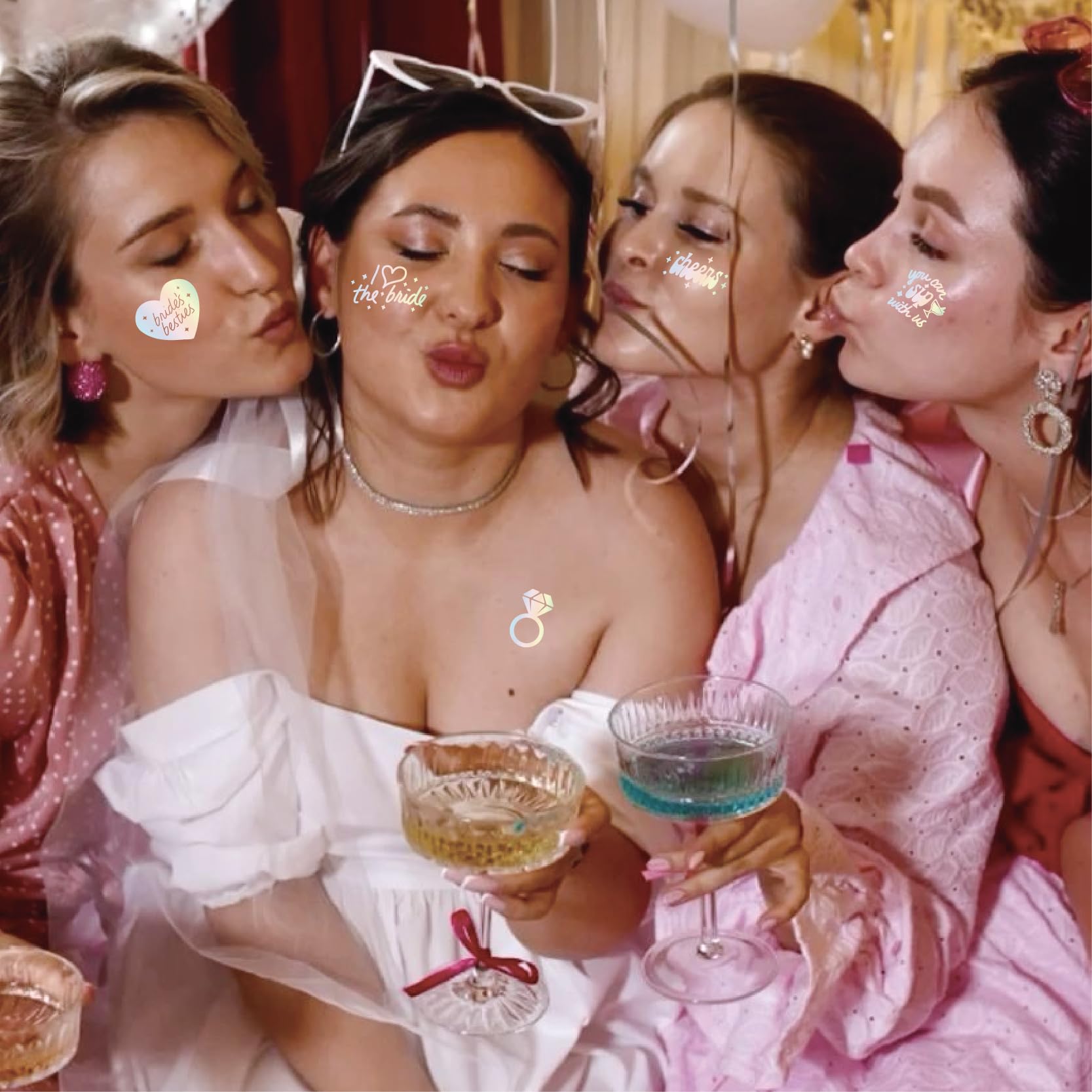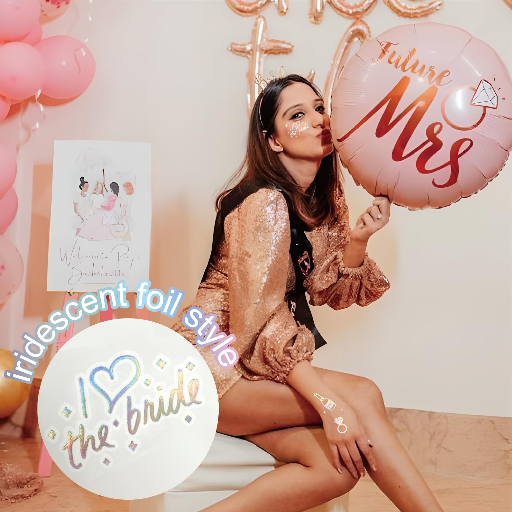 - 【What You Get】Three sheets of iridescent foil tattoos with 80+ tattoos - each sheet measures 8.26 " x 5.9 ".With foil designs like Love Kiss Cheers Crown lips Diamonds Rings Sparkles Bridesmaid, Bride,Team Bride,Bridal, + more. Guaranteed to be the perfect bridal accessory!
