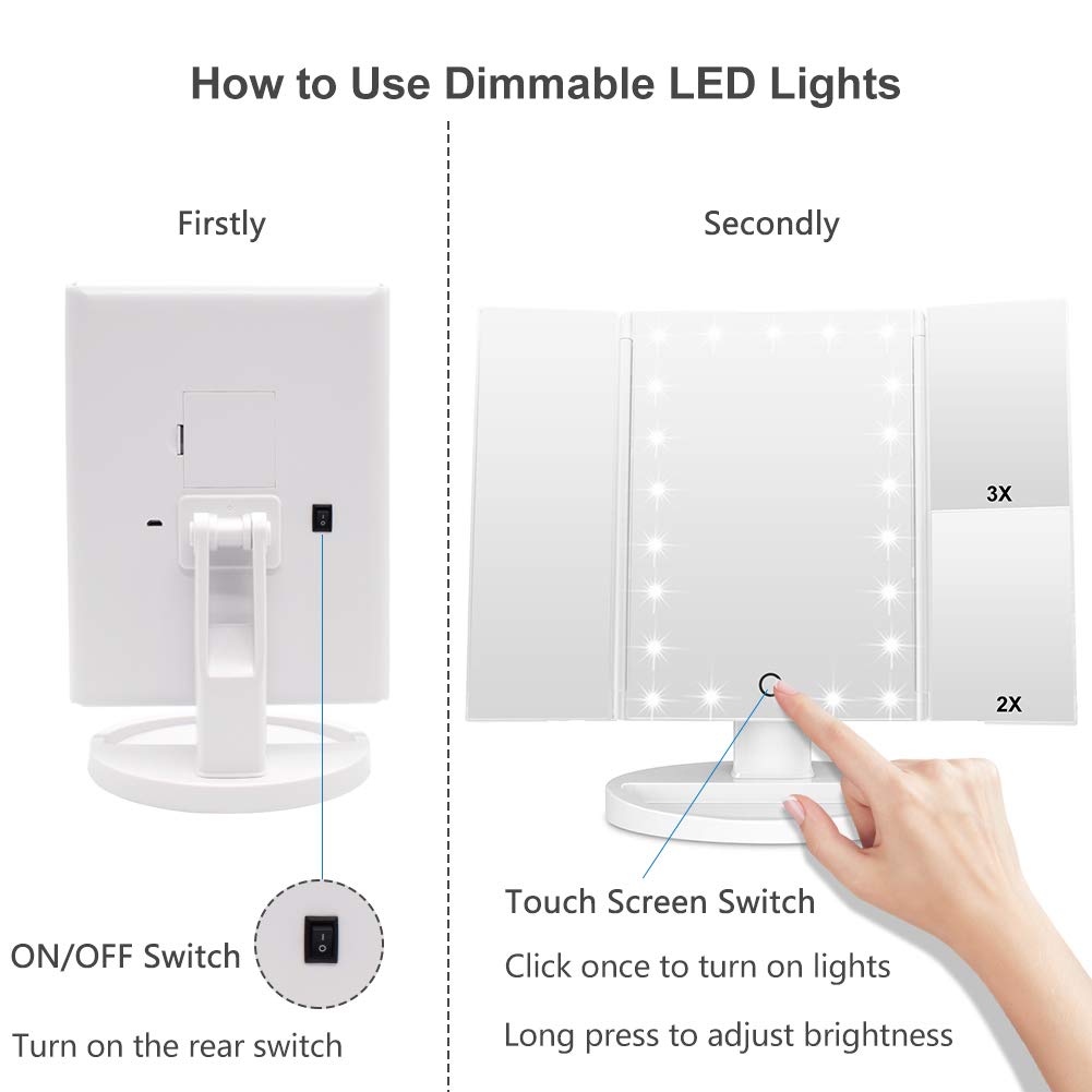 - 180 degree rotation & Tri-fold: The light-emitting makeup mirror on the worktable can be easily adjusted, and the viewing angle can be fixed perfectly and comfortably. Tri-Fold Design :Easy for take away and daily maintenance, can open or fold it like a book when not using to protect it away from the dust or other scratches.The tri-fold and detachable design allows you to take it with you and enjoy delicate makeup anytime, anywhere