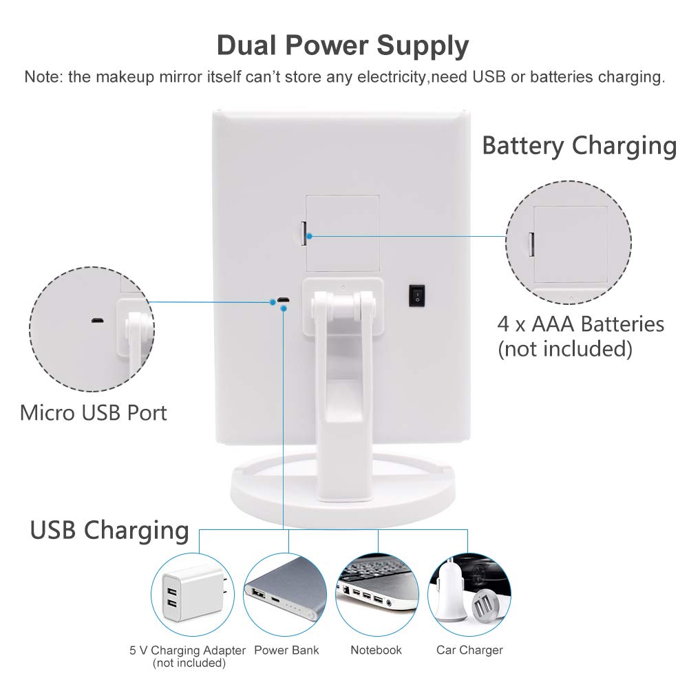 - Dual power supply: This Led mirror can be operated with 4 AAA batteries (not included in the package) or USB cable (including USB cable), the mirror itself cannot store power