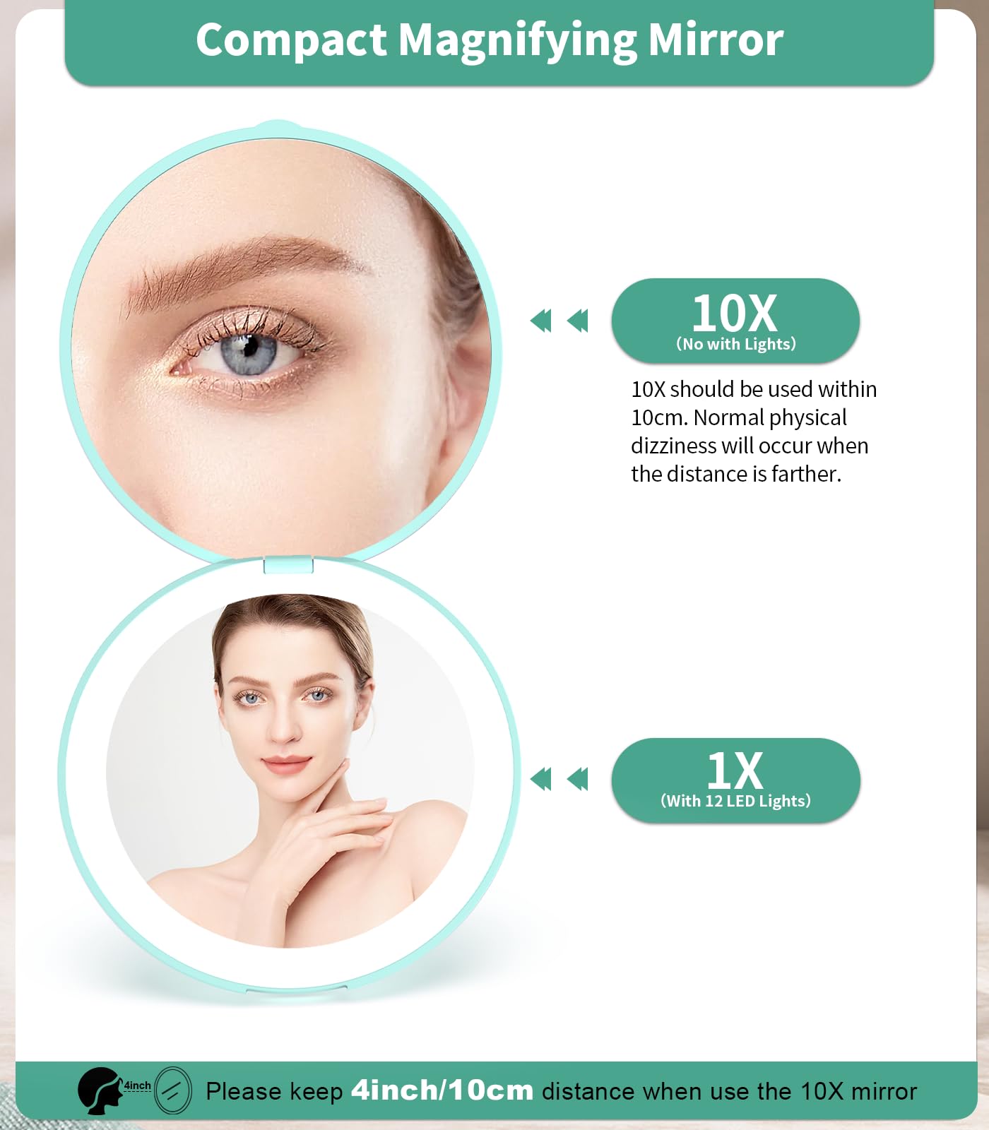 - 10x Magnifying:10x compact magnifying mirror, better magnification of facial details,which is good for makeup needs, shaving, or deep cleaning.Tip: When using the 10x magnifying mirror, please keep a distance of less than 10 cm, otherwise it may cause normal dizziness and affect imaging