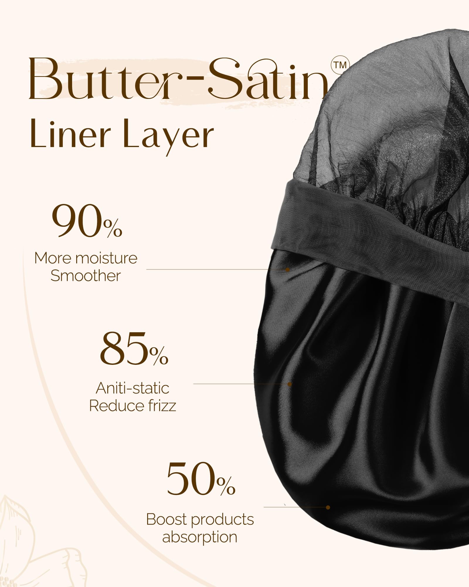 - Butter satin lined: It is as smooth as butter, more softer, bringing luxury feel. Reducing friction to skin and hair, keep it hydrated, moisture and soft. Leaves your hair shiny and untangled in the morning