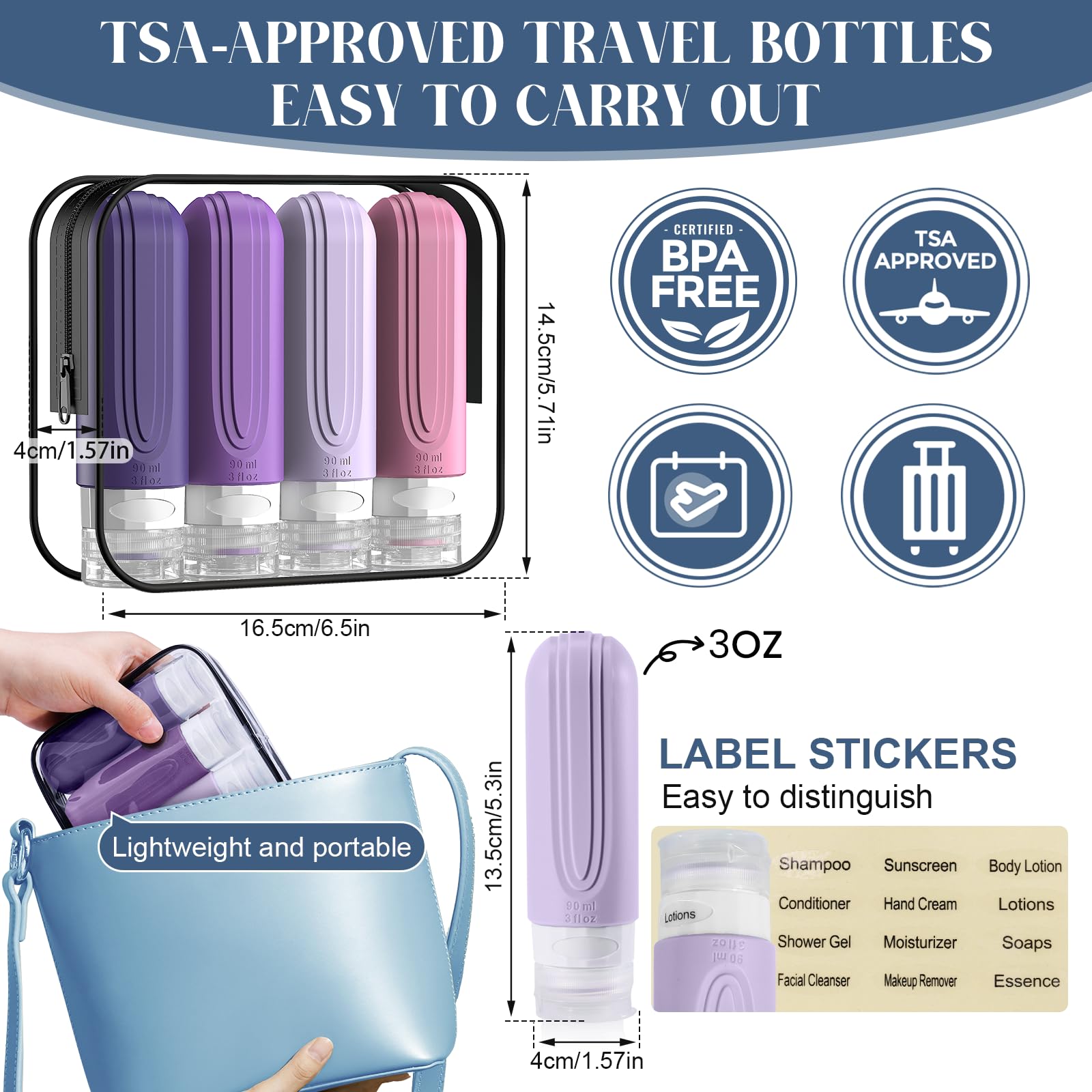 YIIMER Travel Bottles for Toiletries, 3oz TSA Approved Travel Size Toiletries, Silicone Leak-Proof Refillable Containers, Squeezable Liquid Essentials Bottles W/Clear Bag(PURPLE)