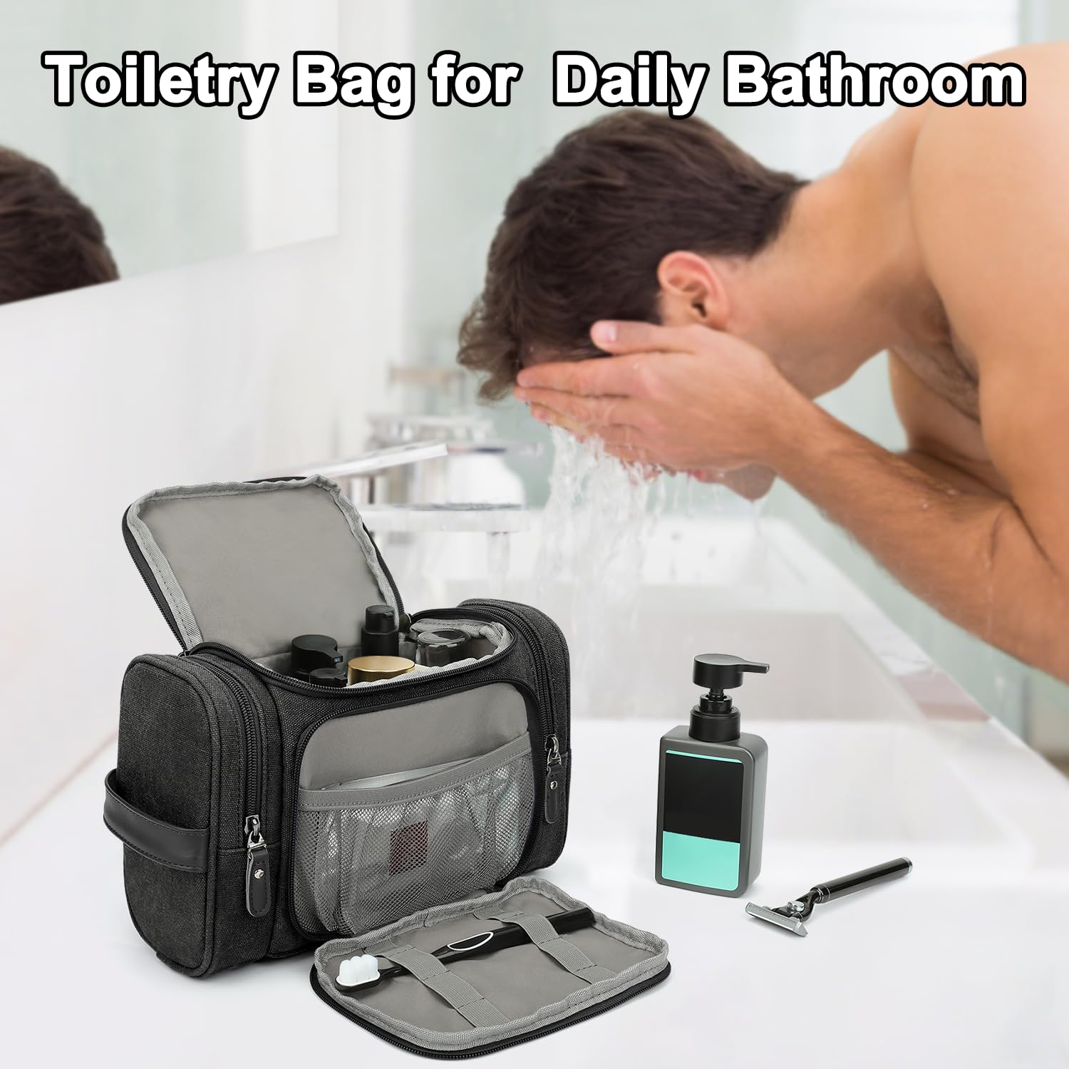 - SPACIOUS AND ORGANIZED DESIGN: Measuring 11.0×3.9×6.7 inches, this toiletry bag features elastic retention bands in the main compartment to securely hold bottles upright. The 180° lay-flat front pocket offers quick access. The travel toiletry bag is perfect for tooth brushes, facial cleansers, travel shampoos, razors, electric shavers, and other toiletries and travel essentials