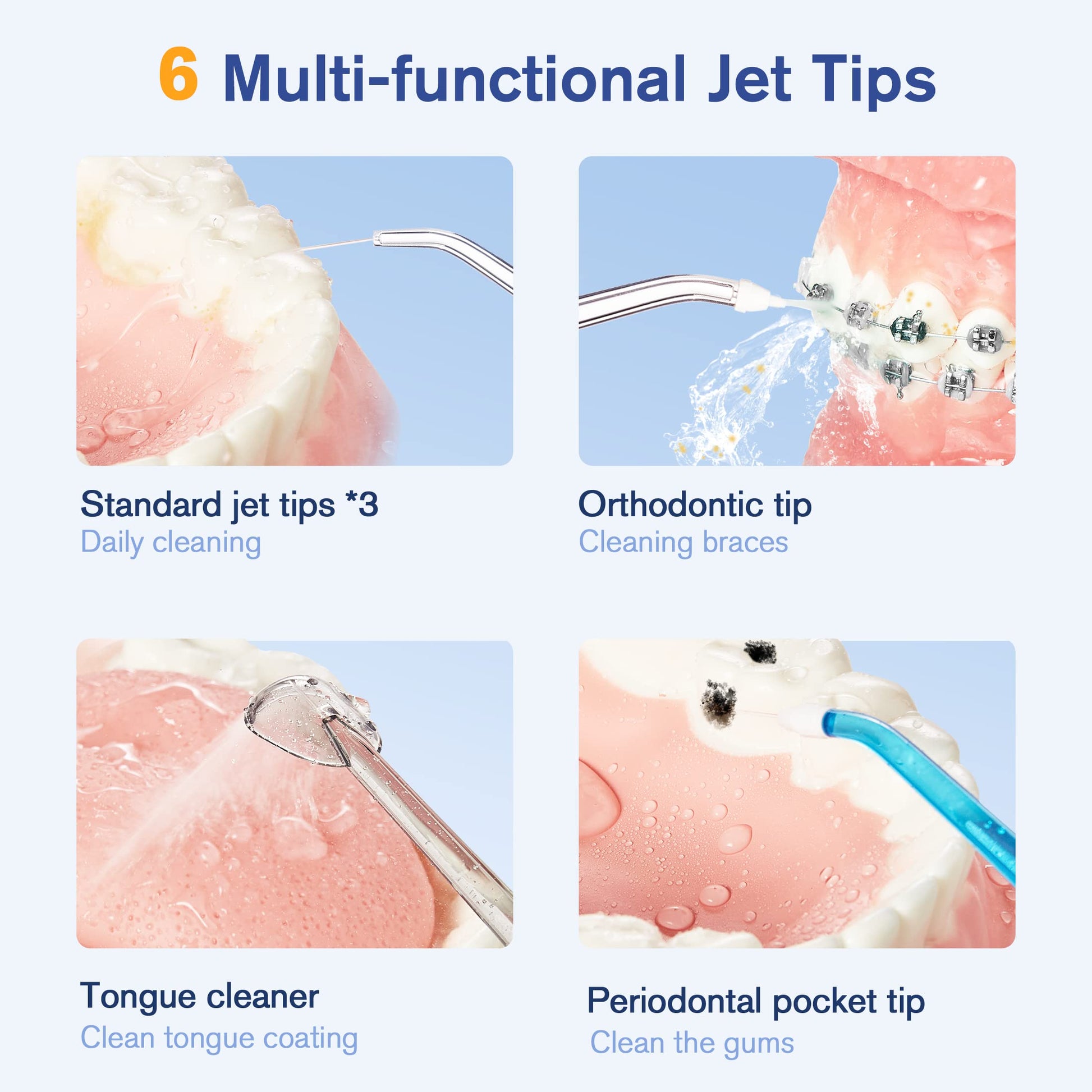 - PERFECT GIFT SET: Package included: 1* oral irrigator, 1* usb cable, 1* manual, 3* standard jet tips, 1* orthodontic tip, 1* tongue cleaner, 1* periodontal pocket tip, 1* storage bag